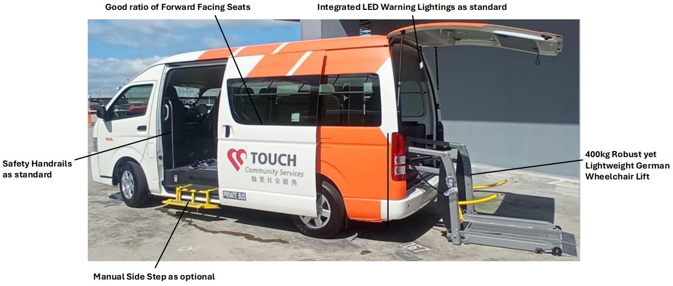 Designed to optimally and safely transport passengers from Point A to Point B, the Handicap Bus with Wheelchair Lifter / Ramp comes with passenger seats and an option of either a Wheelchair Lift or a Ramp to aid wheelchair passengers board the vehicle.